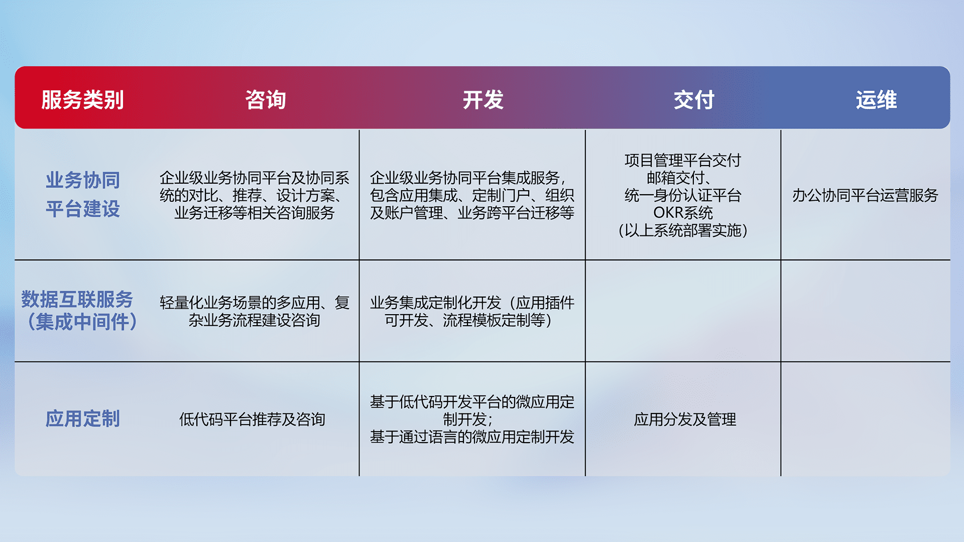 针对钉钉、、、、企微、、、、IDaas等平台级产品提供产品的规划、、、方案、、、交付、、定制化开发等服务,,,,实现如统一协同办公、、、、智能客户服务、、、、混合会议管理、、智能数据查询、、、等业务场景,,,,实现数字化转型。。。